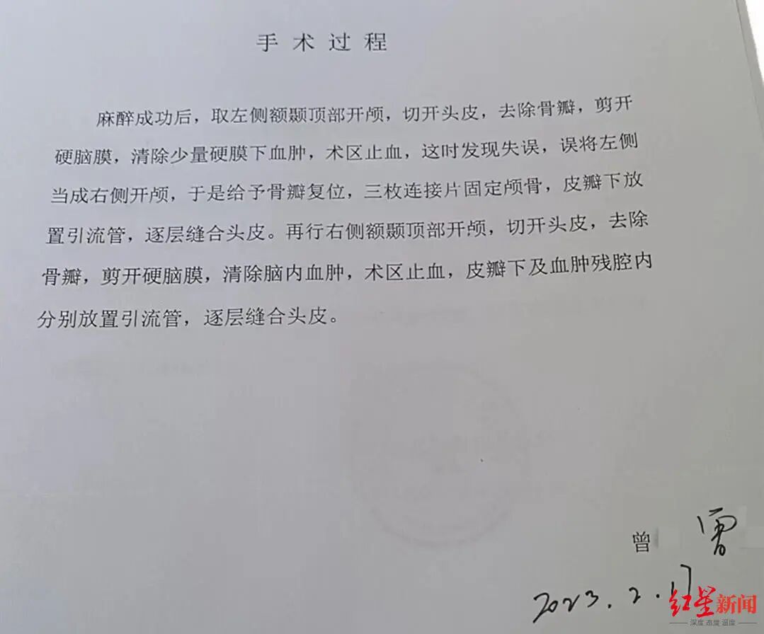 另外,潘女士还提供了一份打印的“手术过程”,上面显示:麻醉成功后,取左侧额颞顶部开颅,切开头皮,去除骨瓣,剪开硬脑膜,清除少量硬膜下血肿,术区止血,这时发现失误,误将左侧当成右侧开颅,于是给予骨瓣复位,三枚连接片固定颅骨,皮瓣下放置引流管,逐层缝合头皮。再行右侧额颞顶部开颅,切开头皮,去除骨瓣,剪开脑硬膜,清除脑内血肿,术区止血,皮瓣下及血肿残腔内分别放置引流管,逐层缝合头皮。最后是主治医生曾某签字,时间是2023年2月17日。