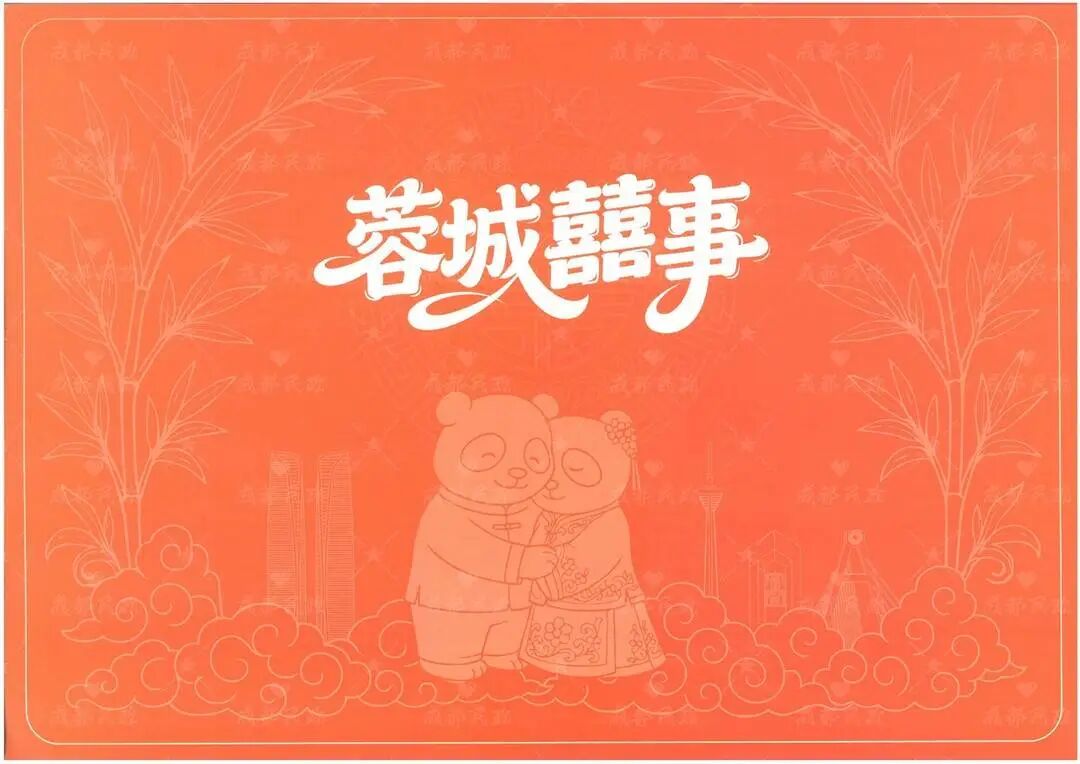 婚书上的证婚词依然置于画面核心,庄重而典雅,与四周的成都特殊元素相呼应。婚书背面,以成都地标为骨、翠竹祥云为脉,将相拥的熊猫藏于其间作为暗纹铺陈,环绕着居于正中的喜字与“蓉城囍事”,寓意良缘天定、琴瑟和鸣。
