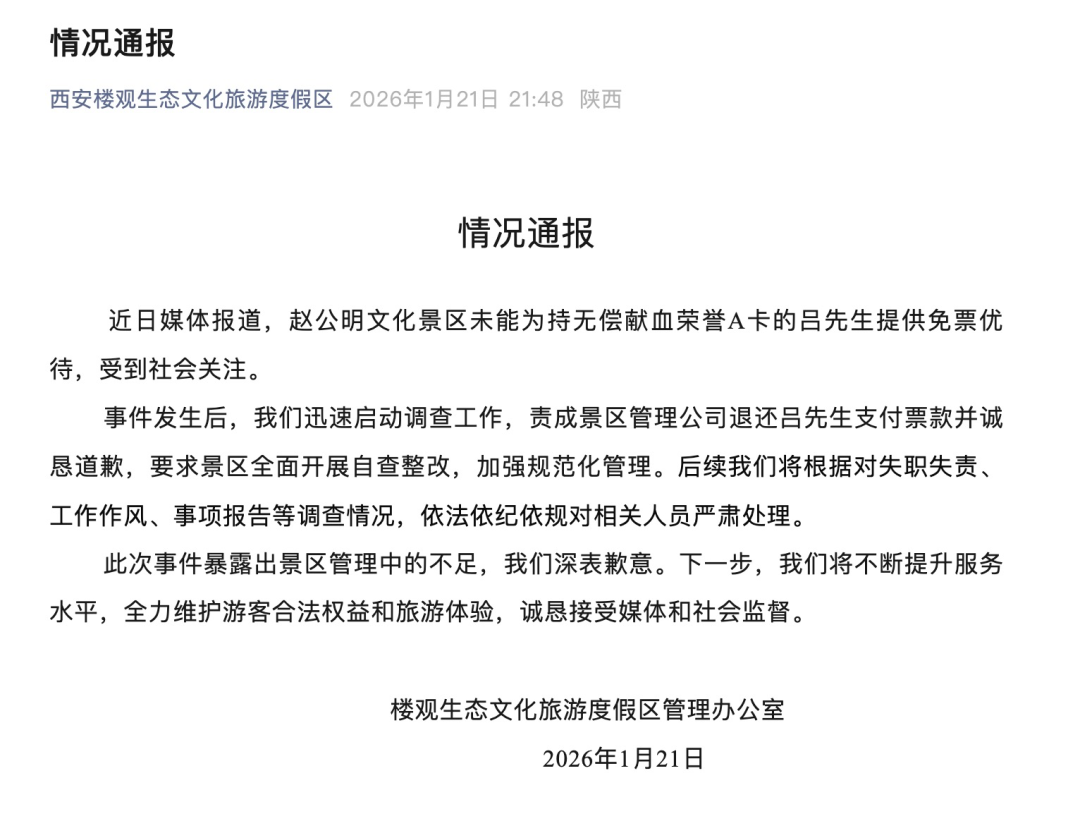 1月21日晚,西安楼观生态文化旅游度假区官方微信公众号发布情况通报:赵公明文化景区未能为持无偿献血荣誉A卡的吕先生提供免票优待,责成景区管理公司退还吕先生支付票款并诚恳道歉,同时将依法依纪依规对相关人员严肃处理。