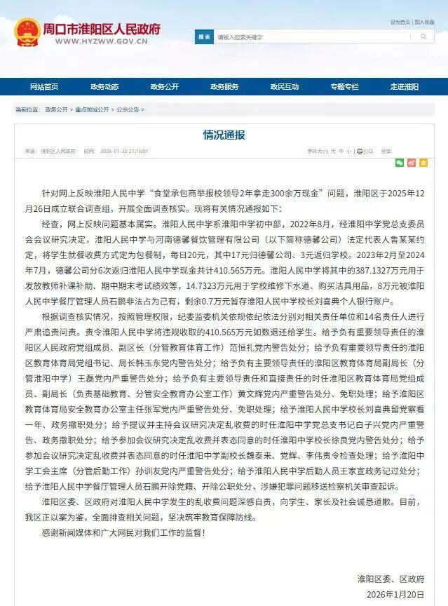 河南省周口市淮阳区人民政府发布通报称,2023年2月至2024年7月间,淮阳人民中学通过与餐饮公司约定“每日20元餐费中3元返归学校”的方式,累计违规收取410.565万元,这些钱款大部分被用于发放教师补课补助、期中期末考试绩效等,14.7323万元用于学校维修下水道、购买洁具用品,还有8万元被餐厅管理人员非法侵占,0.7万元暂存校长个人账户。目前,当地已责令学校将全部违规款项退还学生,包括副区长、区教体局局长、涉事中学校长在内的14名责任人被追责问责。