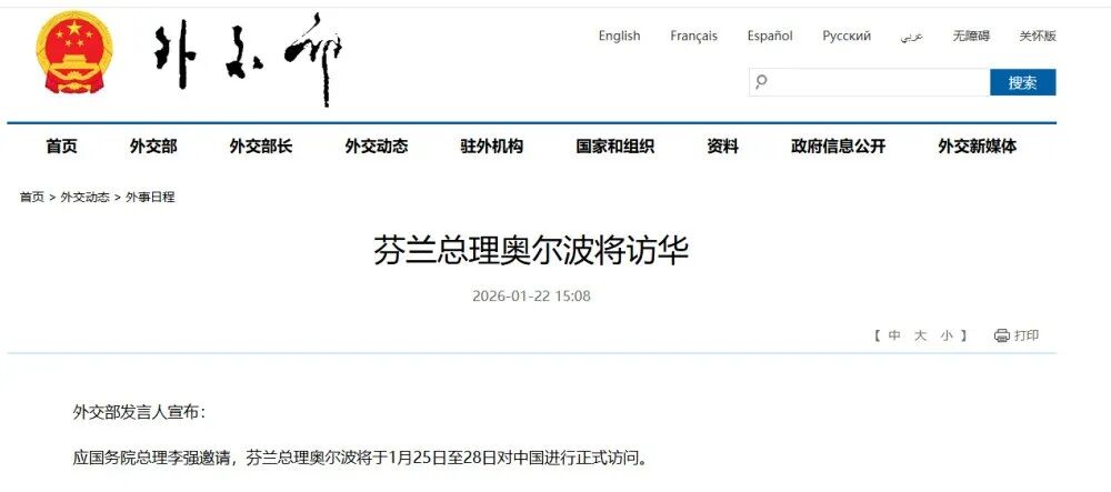 应国务院总理李强邀请,芬兰总理奥尔波将于1月25日至28日对中国进行正式访问。