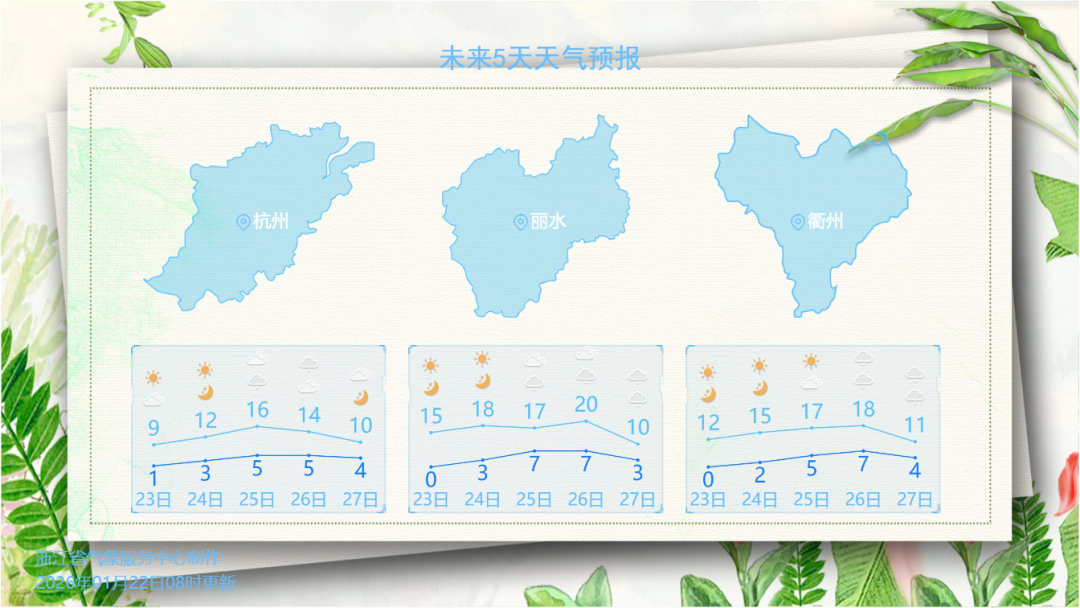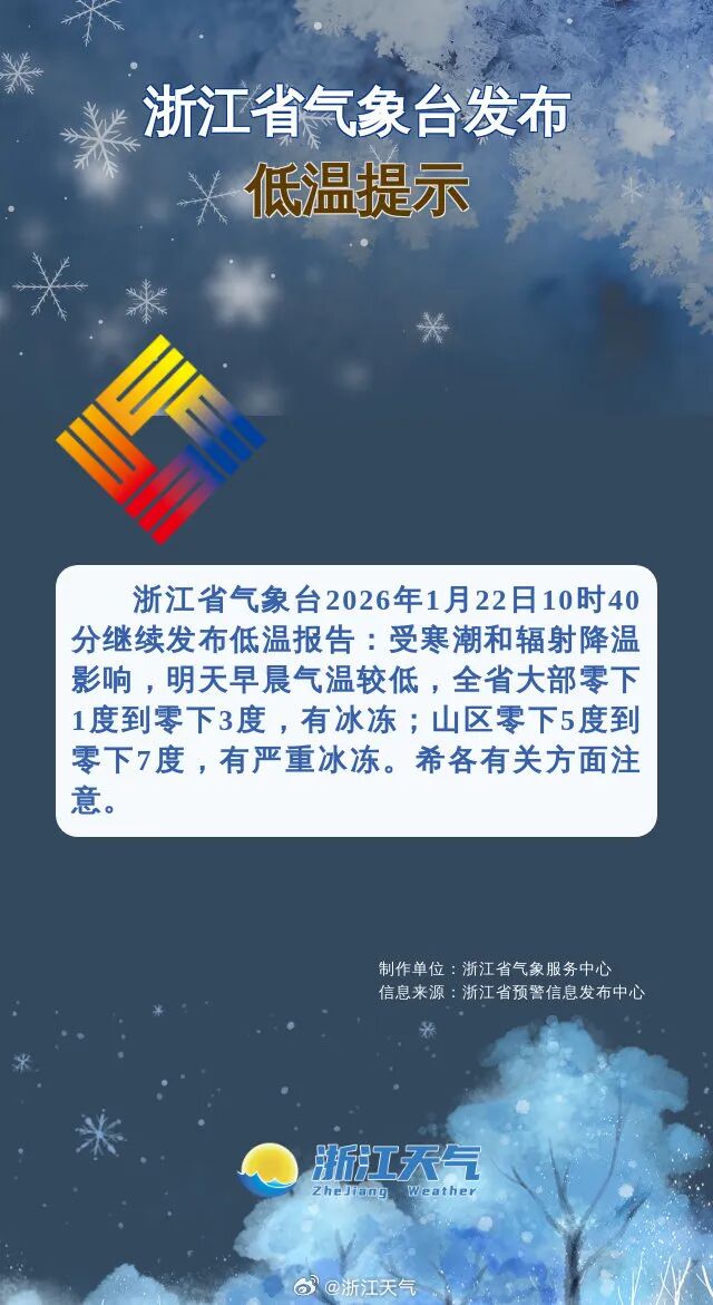 浙江省气象台2026年1月22日10时40分继续发布低温报告:受寒潮和辐射降温影响,明天早晨气温较低,全省大部零下1度到零下3度,有冰冻;山区零下5度到零下7度,有严重冰冻。希各有关方面注意。