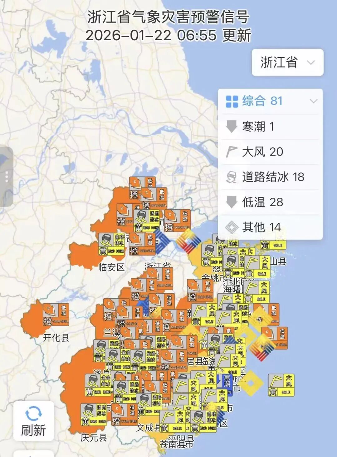 寒潮的影响仍在持续,今天早上,浙江全省在零下的地区依旧不少,尤其是浙北地区,大部最低气温在0~-2℃,其中最低的安吉达到了-2.9℃。今早,浙江省气象灾害预警信号有81个。
