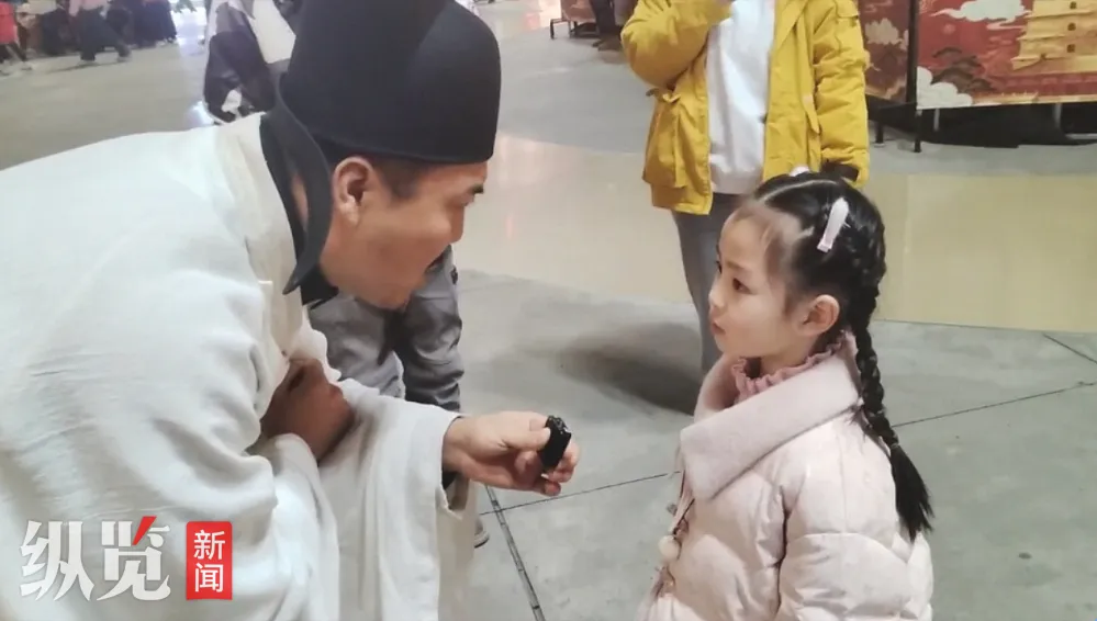 1月17日,河北承德5岁半女孩安米在西安大唐不夜城与博主“小陕西”扮演的李白即兴对诗。供图:安米妈妈