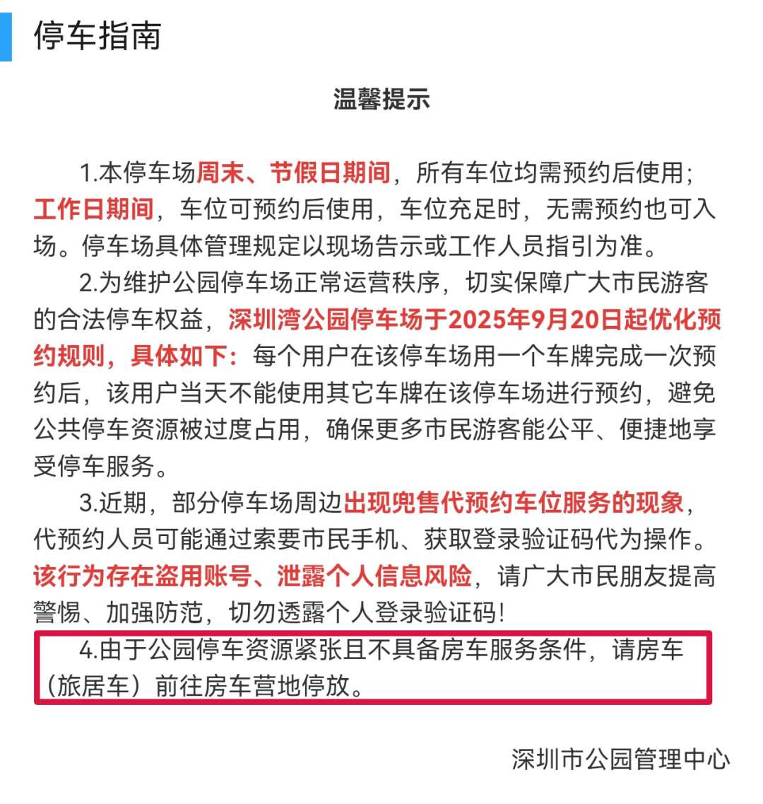 深圳市公园管理中心也发布提示:由于公园停车资源紧张且不具备房车服务条件,请房车(旅居车)前往房车营地停放。