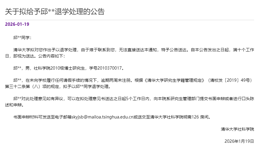 邱**同学:清华大学拟对您作出予以退学处理,由于难于联系到您,无法直接送达本通知,特予公告送达。自本公告发出之日起,满十个工作日,即视为送达。公告内容如下: