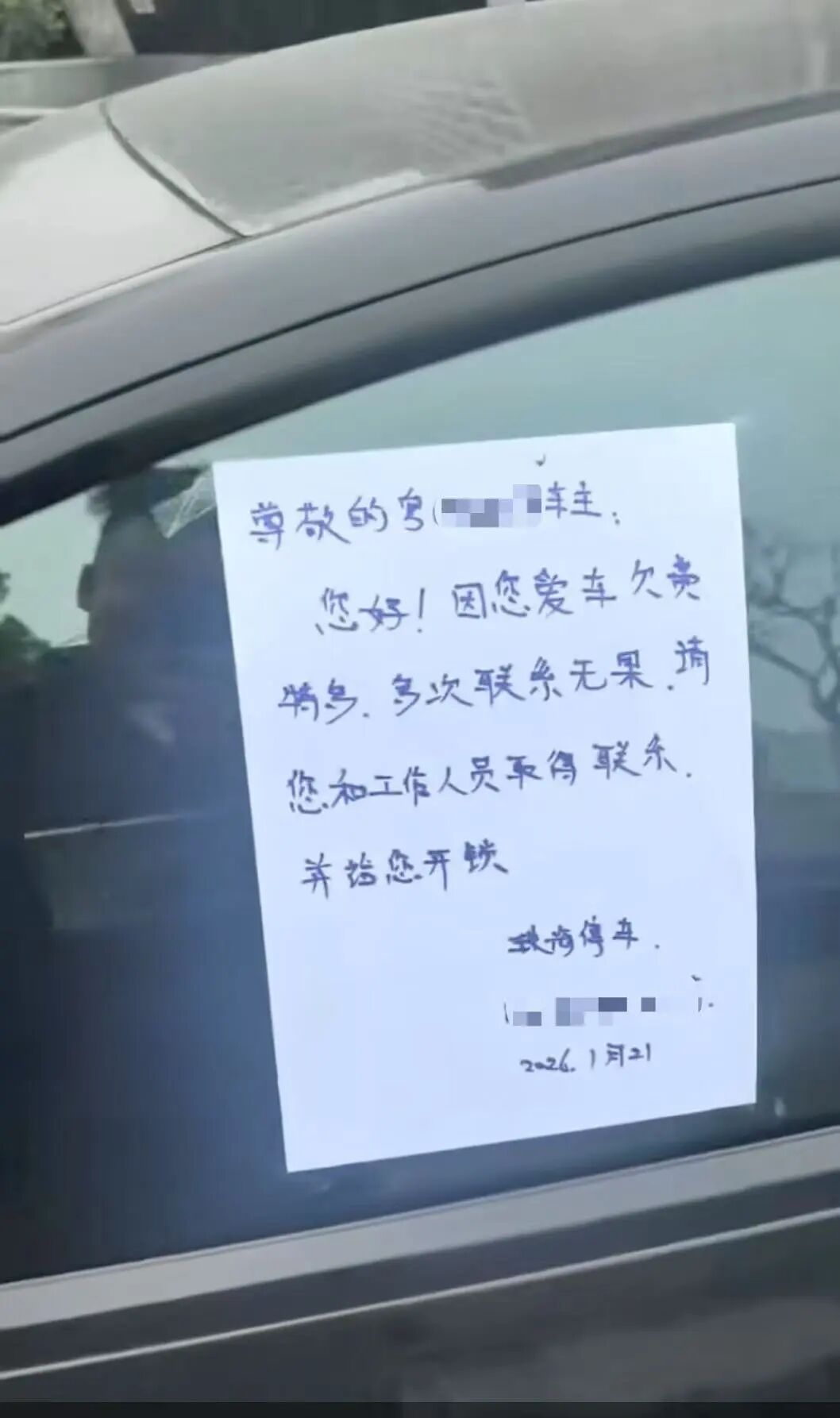 视频显示,一辆停在停车位内的轿车前轮被锁,车窗贴有手写告知单,写明该车因“欠费特多”且“多次联系无果”,要求车主联系工作人员开锁。落款为“珠海停车”,附有电话与日期。视频中可听到有人称“现在珠海欠费的都这么XX吗?”“锁上了”。