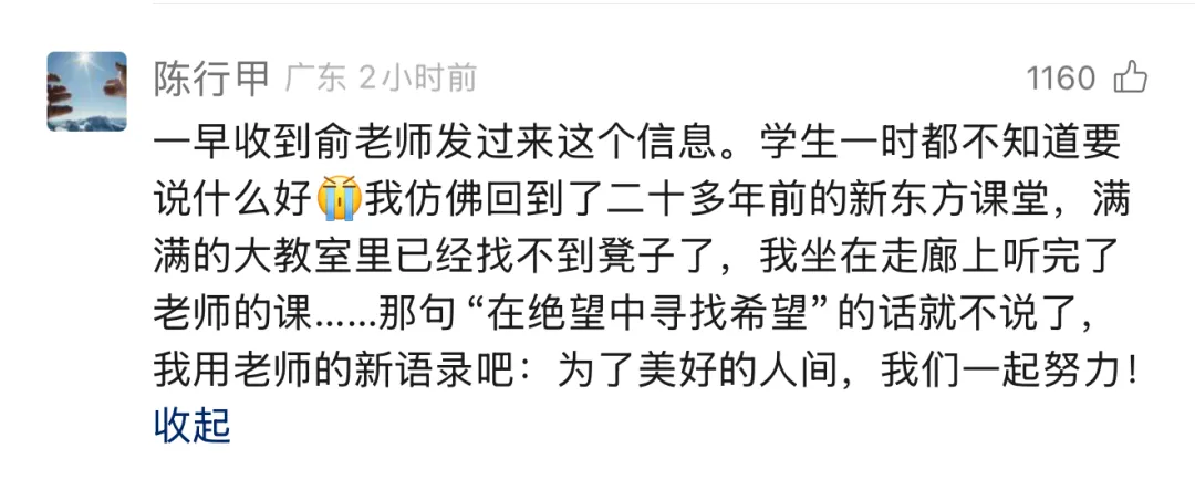 我仿佛回到了二十多年前的新东方课堂,满满的大教室里已经找不到凳子了,我坐在走廊上听完了老师的课……那句“在绝望中寻找希望”的话就不说了,我用老师的新语录吧:为了美好的人间,我们一起努力!