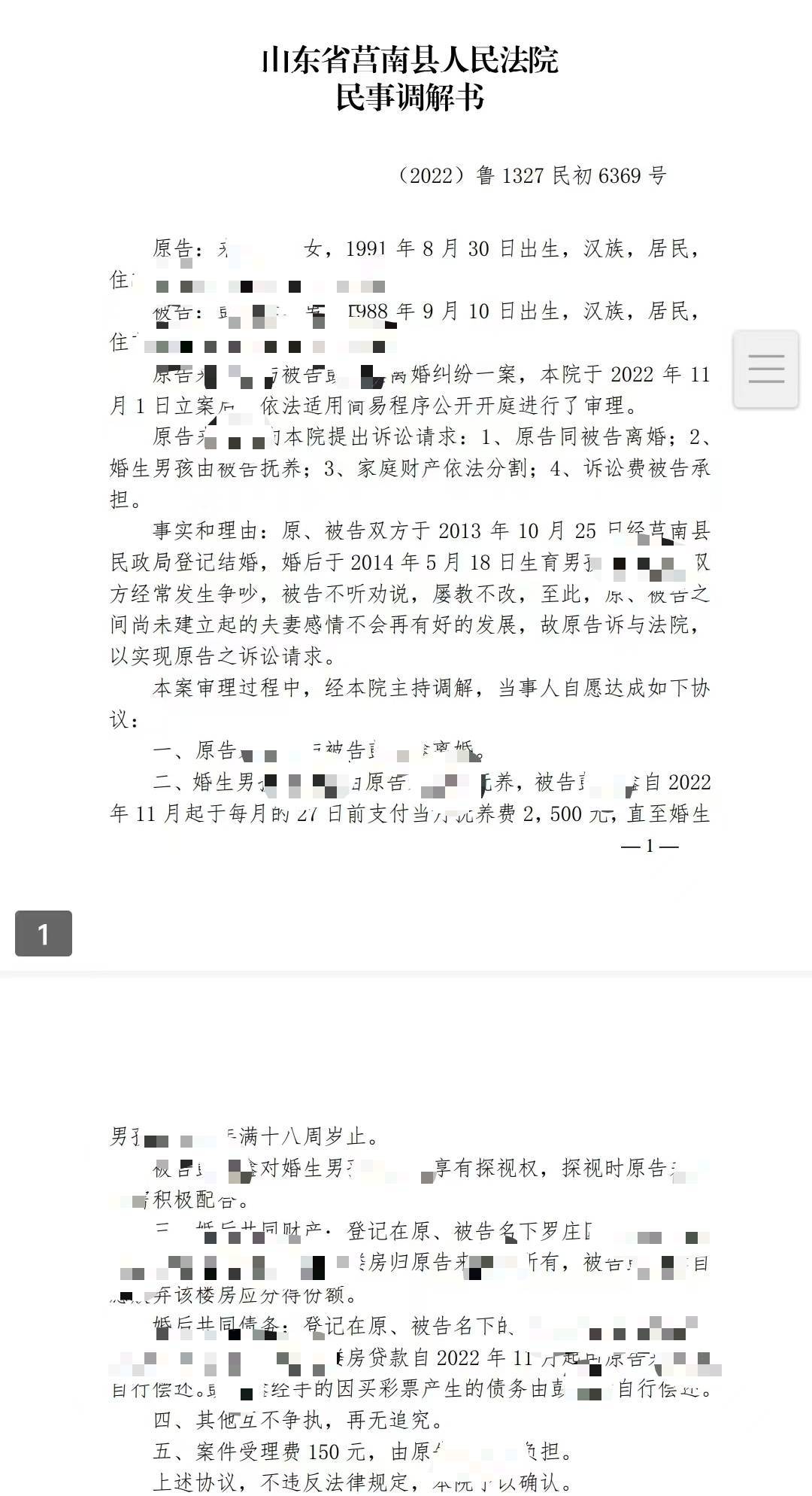 2022年,来女士通过诉讼和彭某鑫离婚,拿到了孩子的抚养权。法院调解书显示,双方达成协议,彭某鑫每月支付抚养费2500元。两人也就婚后财产和债务进行了协商,房屋产权归来女士所有,房屋贷款由她一人偿还,彭某鑫经手的因买彩票产生的债务由其自行偿还。