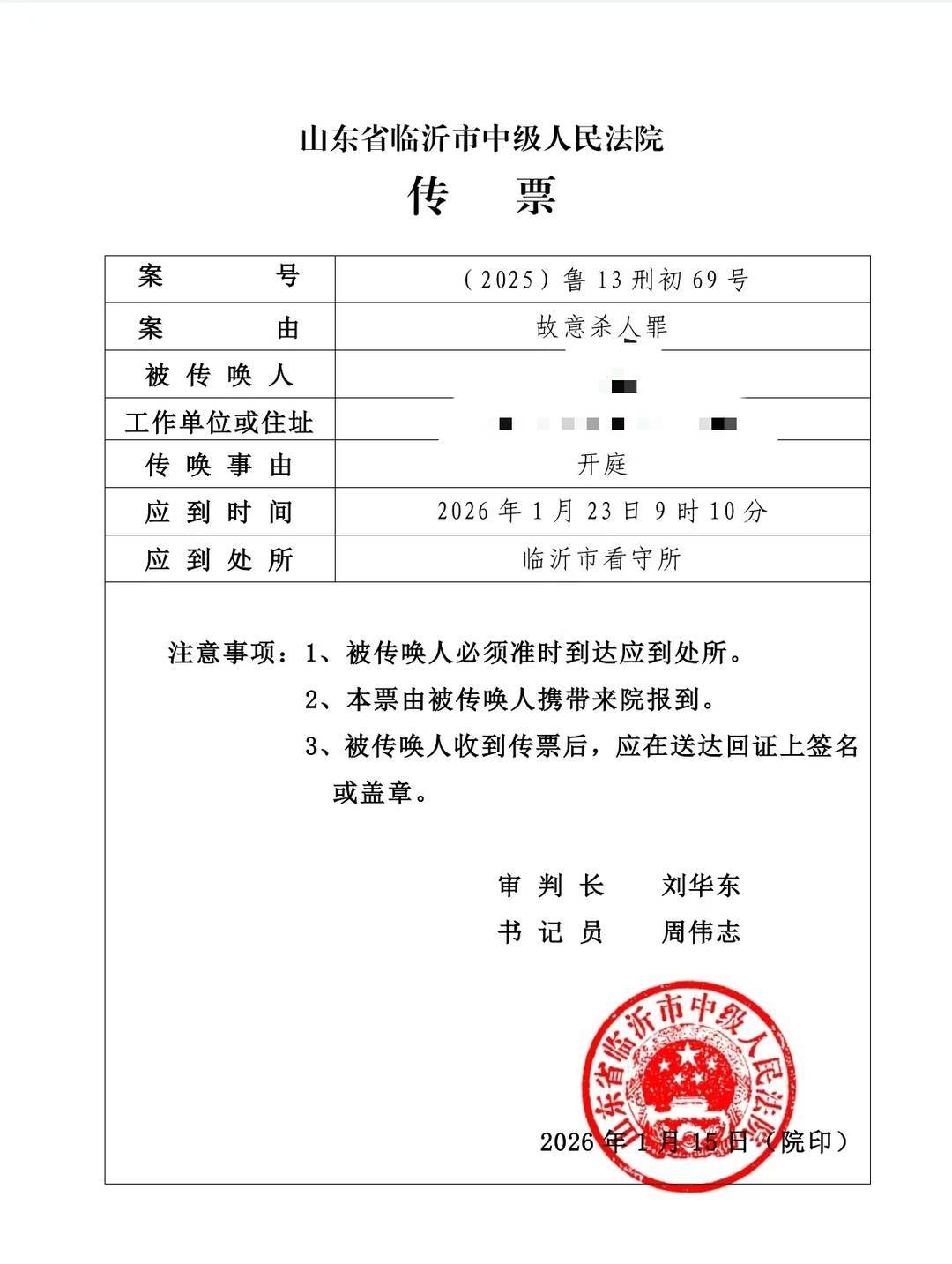 1月20日,“山东临沂男子当儿子面杀害前妻”案受害人弟弟告诉封面新闻记者,家属已收到临沂市中级人民法院传票,案件将于1月23日上午9点10分在临沂市看守所开庭审理。