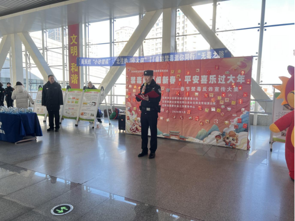 春回人间添祥瑞,禁毒护民谱新篇。1月20日下午,沈阳北站北广场候车大厅内热闹非凡。由辽宁省沈阳市公安局皇姑分局禁毒大队主办的“禁毒纳福闹新春・平安喜乐过大年”禁毒反诈宣传大集活动热闹开集,千余名返乡旅客在候车间隙沉浸式学习禁毒知识,将“无毒平安”的新春祝福带回家。