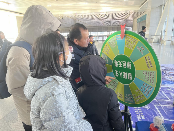 禁毒知识互动区前早已排起长队。仿真毒品模型展台前,民警及禁毒社工正结合“奶茶粉”“跳跳糖”等伪装毒品讲解识别技巧:“这些看似普通的‘零食’,可能藏着新型毒品的陷阱,陌生人给的东西千万不能碰。”刚参观完模型的旅客便去转动禁毒知识转盘,答对题目后接过“禁毒福字”喜不自禁:“候车时还能学知识赢禁毒纪念品,这种形式太接地气了。”