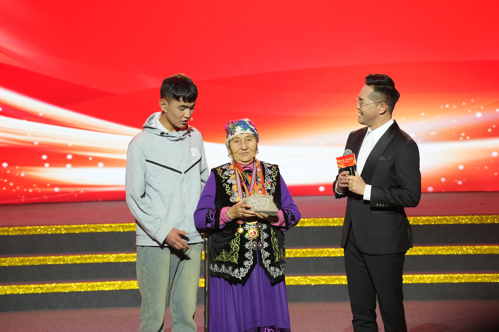 新疆维吾尔自治区乌恰县吉根乡护边员布茹玛汗·毛勒朵60年如一日在海拔5000米的高山之上巡边,累计行程超8万公里、用双手刻下10万多块“中国石”。图为布茹玛汗·毛勒朵(中)带着“中国石”来到现场。漆世平 摄