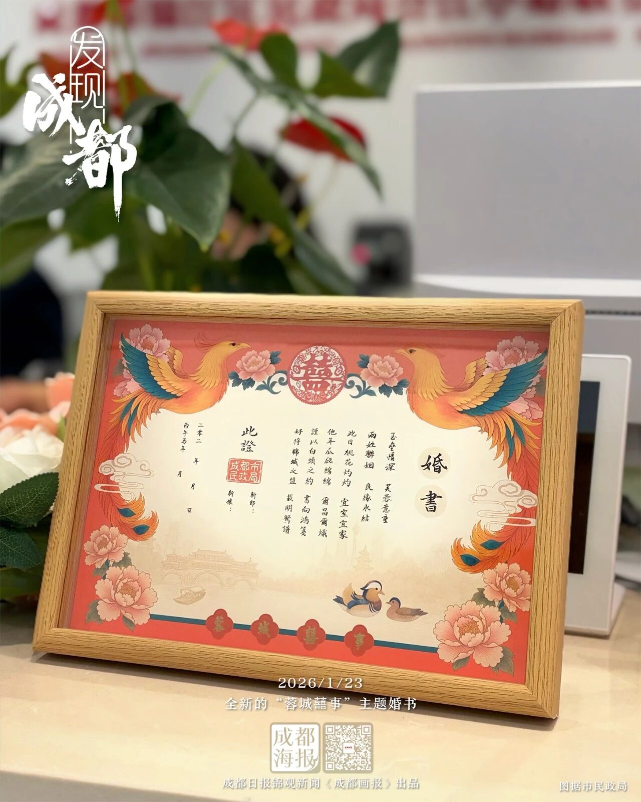 2025年4月2日起,成都为每对登记结婚的新人精心准备了一份免费婚书。截至目前,全市已有10万余对新人成功领取这份“爱在成都”婚书。记者从市民政局处获悉,2026年婚书依旧免费发。不仅如此,这份深受新人喜爱的定制婚书即将在春节后迎来更新,全新的“蓉城囍事”主题婚书将于大年初一正式上线。市民政局提示,这份“蓉城囍事”主题婚书目前仅限在成都办理结婚登记的新人领取。领取时,新人可根据个人喜好自选婚书样式——木质相框款、红色花纹卷筒款,选定样式后婚姻登记员可现场为新人装裱婚书并送上专属祝福。记者 杨升涛 图据市民政局制图 曹劲松 严瑾编辑 严心怡审核 周杨云