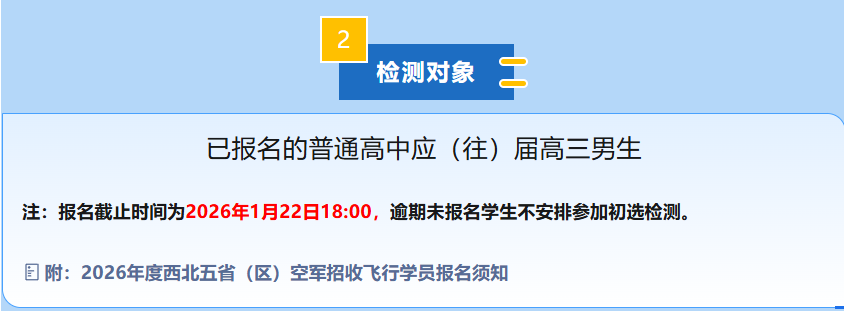 记者从相关部门获悉,本次初选检测定于1月24日至25日进行。有意报考空军飞行员的考生须通过微信小程序“招飞智询”完成线上报名。招飞部门特别提醒,严格执行报名截止时间,未在规定时间内完成报名的学生将无法安排参加本次初选检测。