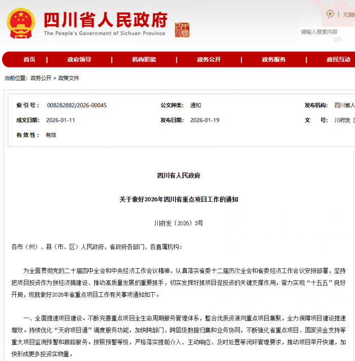 1月9日,四川省人民政府印发《关于做好2026年四川省重点项目工作的通知》(以下简称《通知》),对2026年省重点项目工作进行全面部署,并随文发布《2026年四川省重点项目名单》,其中续建项目526个、新开工项目304个。