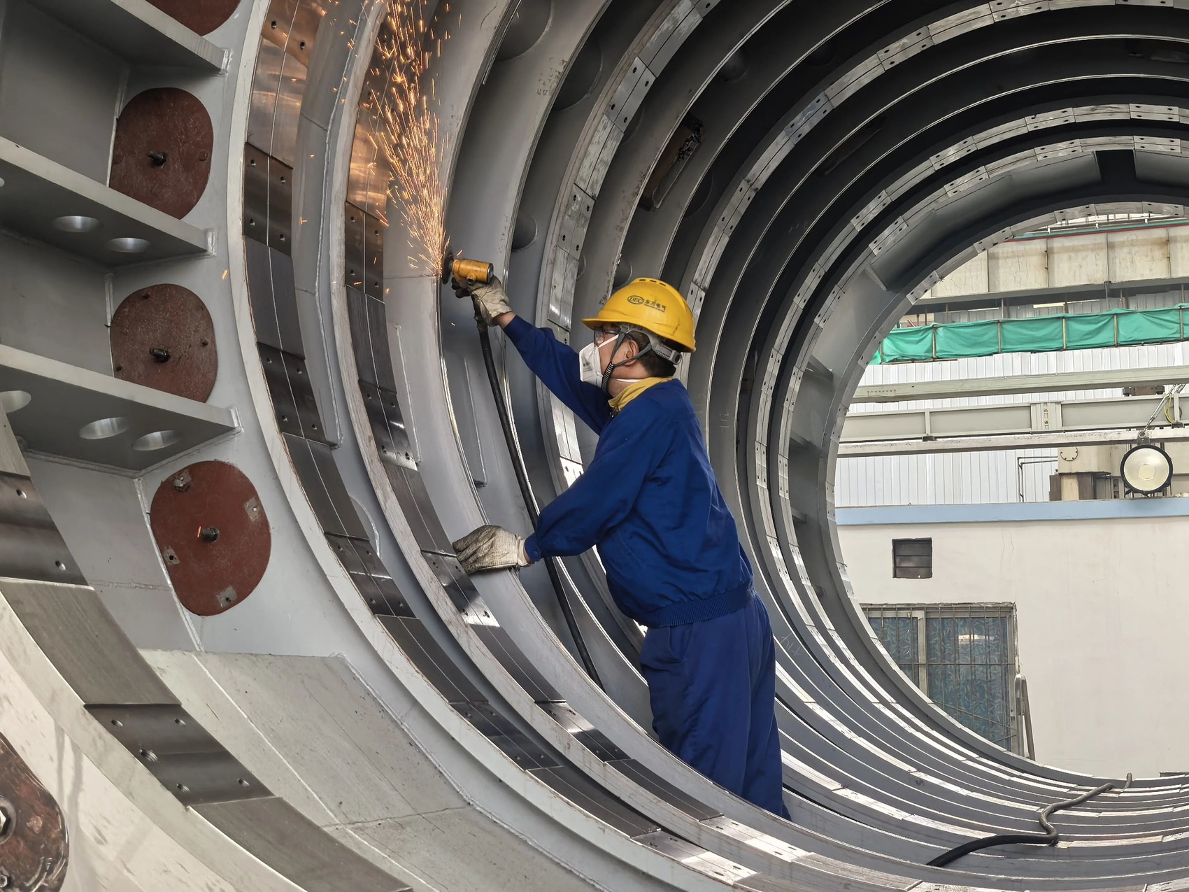 东方电机重金工分厂职工清理定子机座。东方电机供图