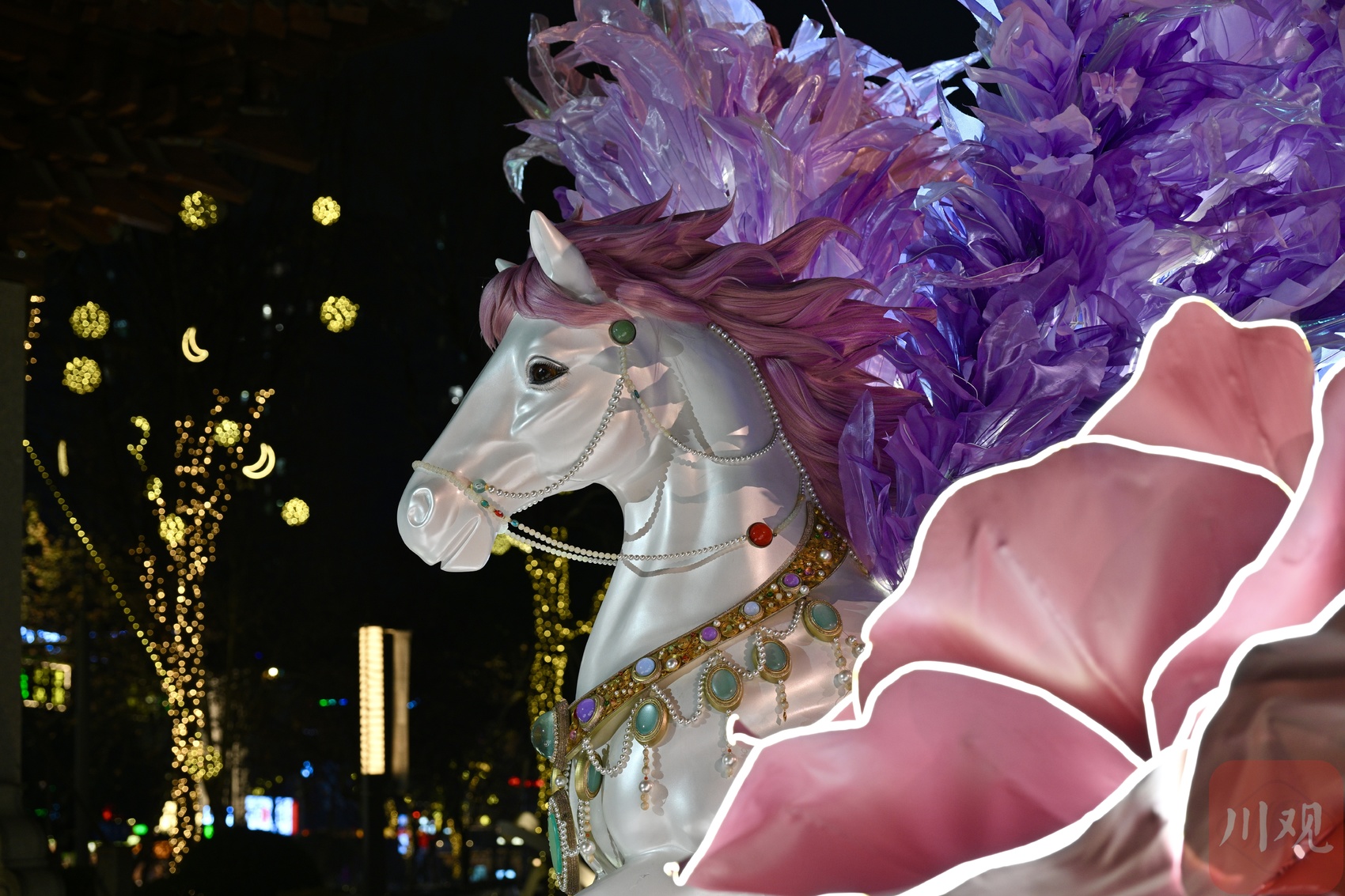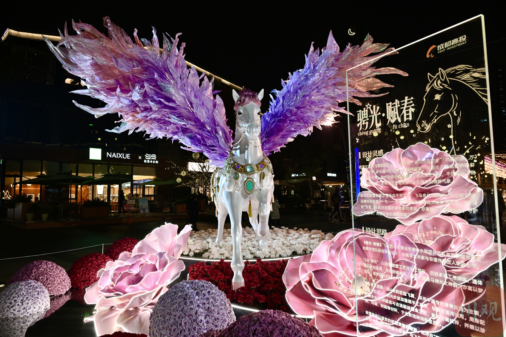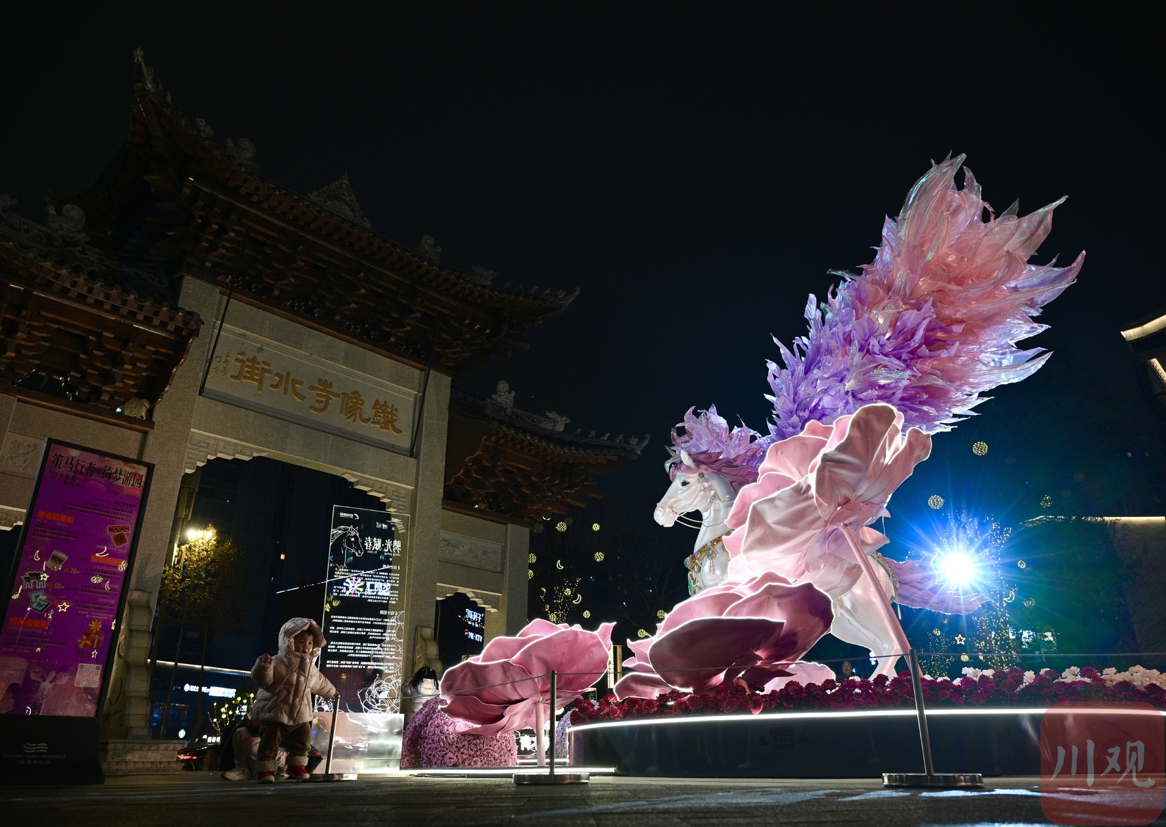 1月22日晚,成都高新区铁像寺水街“策马行春 绮梦游园”主题活动火热进行。其中核心景观——大型飞马艺术装置“骋光·赋春”凭借惊艳造型,迅速成为市民打卡新地标。