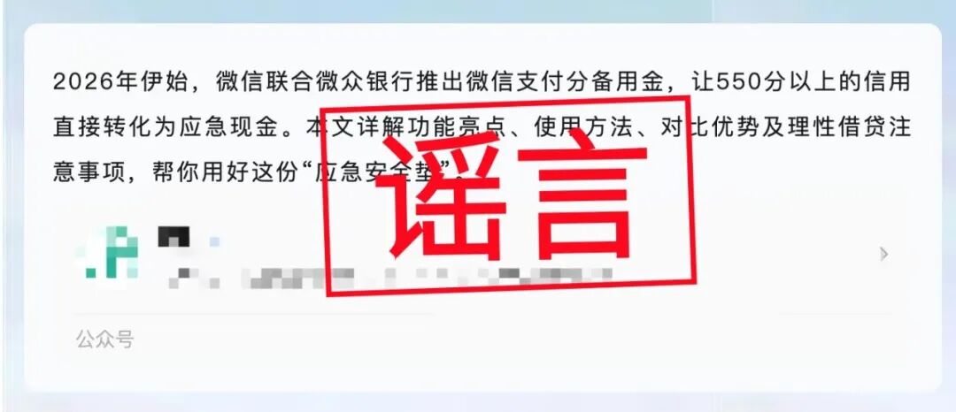 21日,微信官方辟谣平台发布消息:最近,网络上出现部分文章称,“2026年1月,微众银行联合微信推出的「微信支付分备用额度」正式上线”。