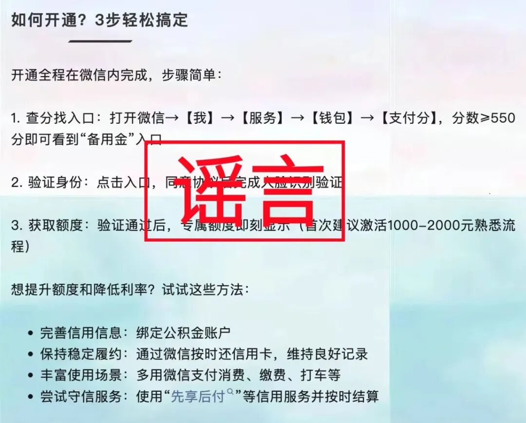经核实,上述信息不属实。这类文章冒用微信支付分和微众银行的名义,声称“微信支付分能领备用金”、或“支付分达标即可提现”。