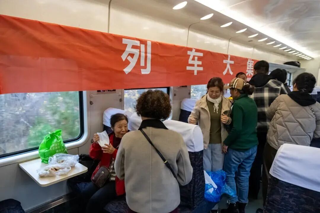 为了丰富旅客的旅途生活,列车每周末举办“周末影院”,播放老百姓喜爱的老电影;还定期组织“列车大集”,为当地农户提供销售土特产的平台,助力乡村振兴。