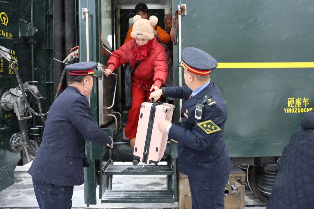 列车每次停车后,王殿凯和列车员都会先行下车,在最近的车门口耐心帮扶旅客上车。
