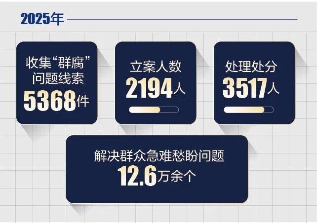 2025年,全市共收集“群腐”问题线索5368件、立案2194人、处理处分3517人,推动解决群众急难愁盼问题12.6万余个,收到群众赠送锦旗1186面、感谢信744封。