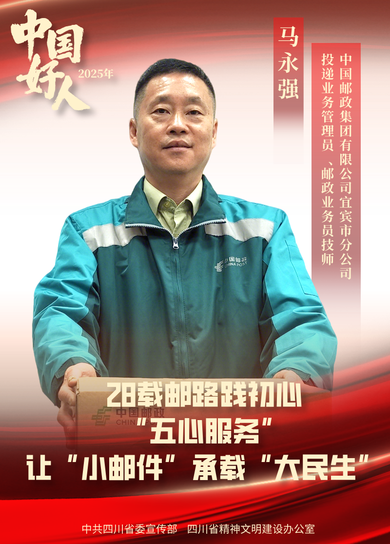 1月23日,“中国好人榜”发布仪式在四川宜宾举办。中国邮政集团有限公司宜宾市分公司投递业务管理员马永强入选“中国好人榜”敬业奉献类名单。