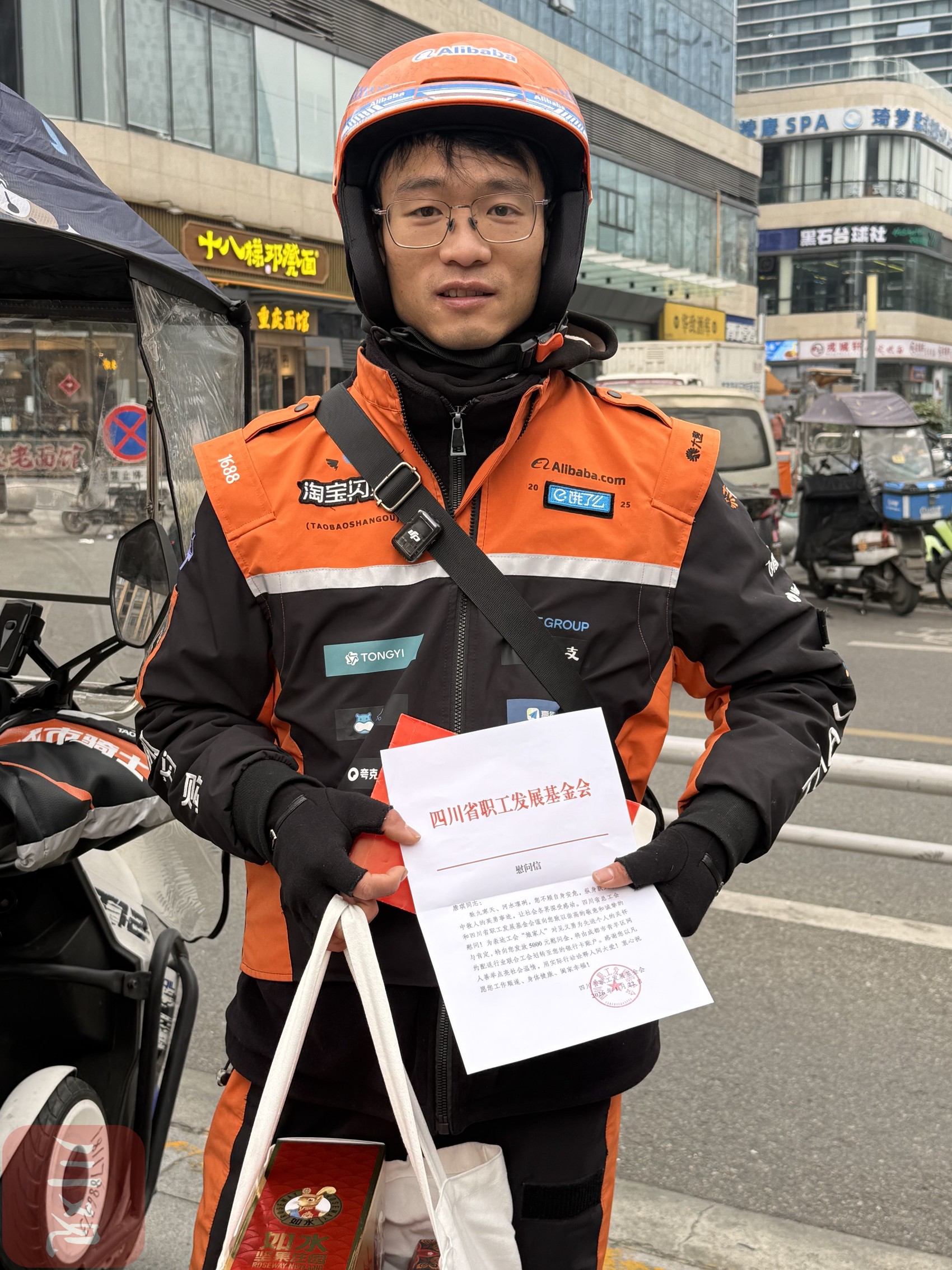 “数九寒天、河水凛冽,他不顾自身安危,纵身跃入水中救人。我们通过工会联系到他,并专程在他跑单间隙赶来,送上这份慰问。”该工作人员表示,慰问金将通过成都市青羊区网约配送行业联合工会划转至唐琪账户。