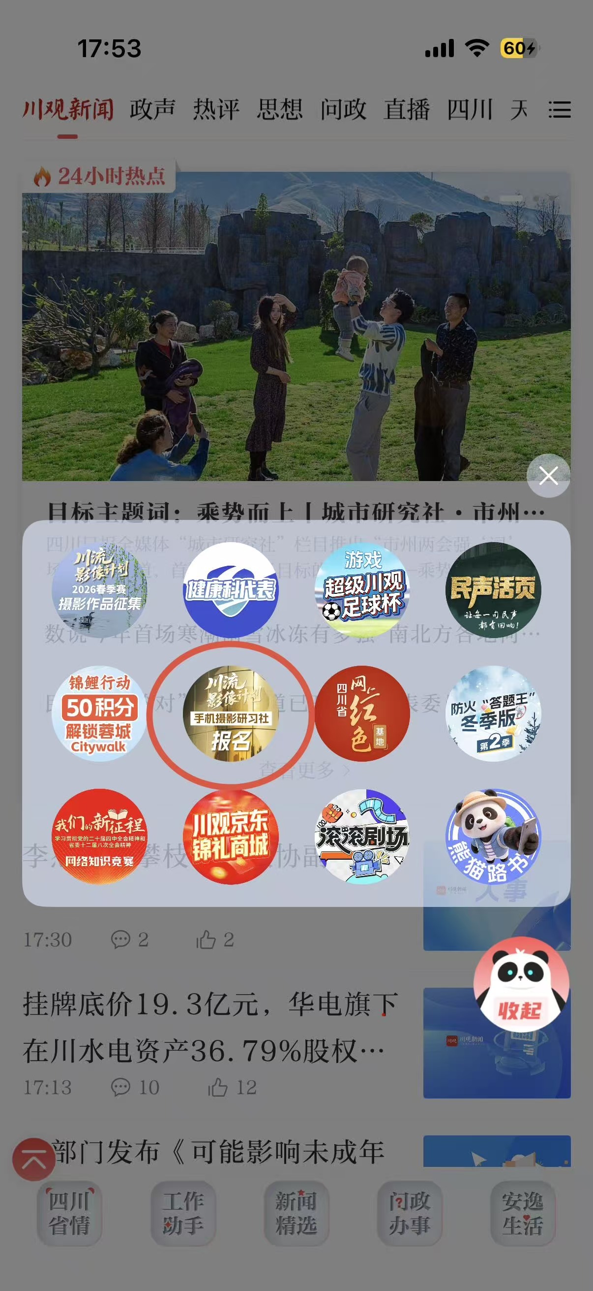 方式一:在川观新闻首页,点击右下方悬浮球,找到“手机摄影”报名通道图片,点击即可参与报名;