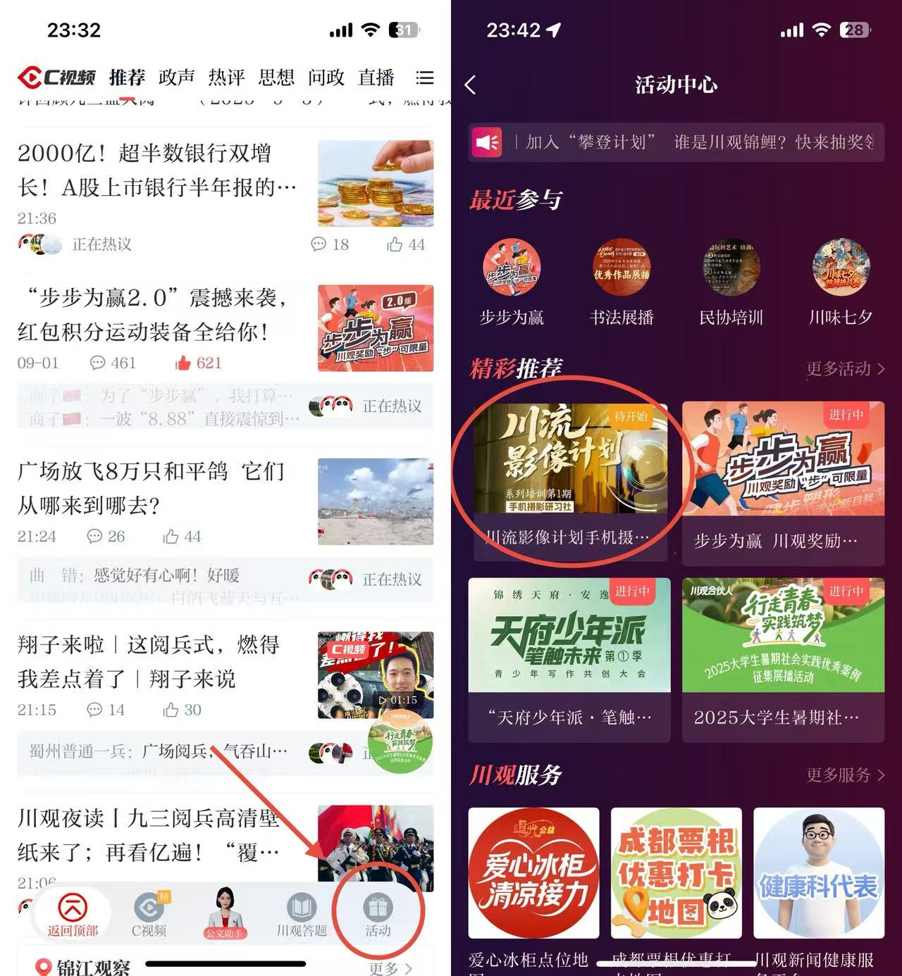 方式二:在川观新闻首页,点击右上角“我的”,点击“活动中心”,找到“手机摄影”报名通道图片,点击即可参与报名;