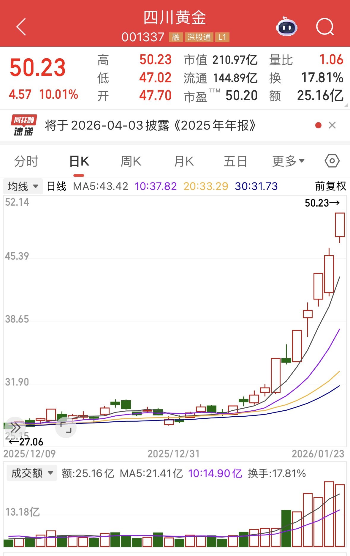 再看“明星”板块——贵金属。湖南白银一路飙高,1月以来股价累计上涨超137%,收报16.44元/股,创下历史新高。四川黄金更是再次登顶板块涨幅榜首位,斩获“10cm”涨停,本周累计上涨超46%,本月累计上涨超80%。