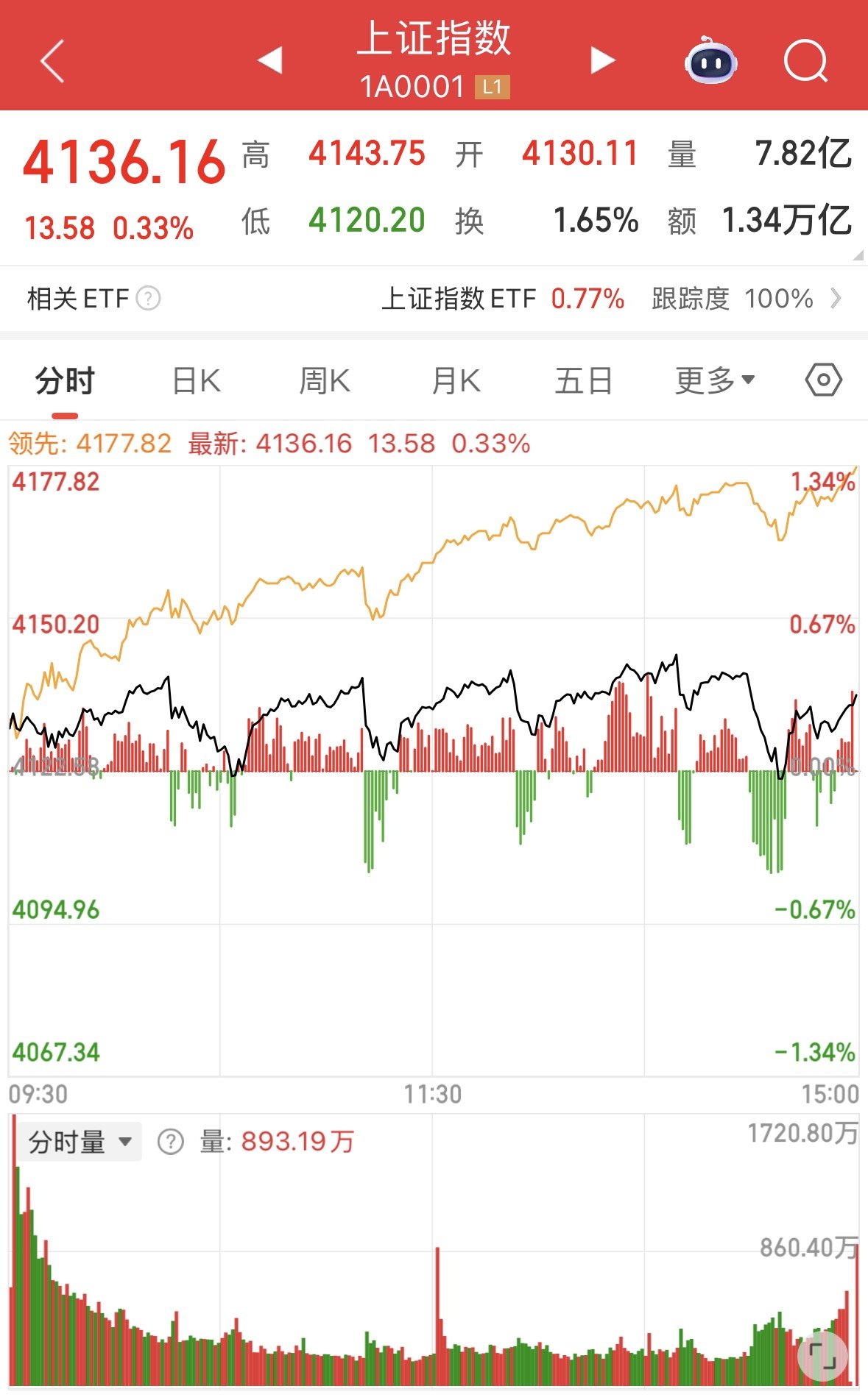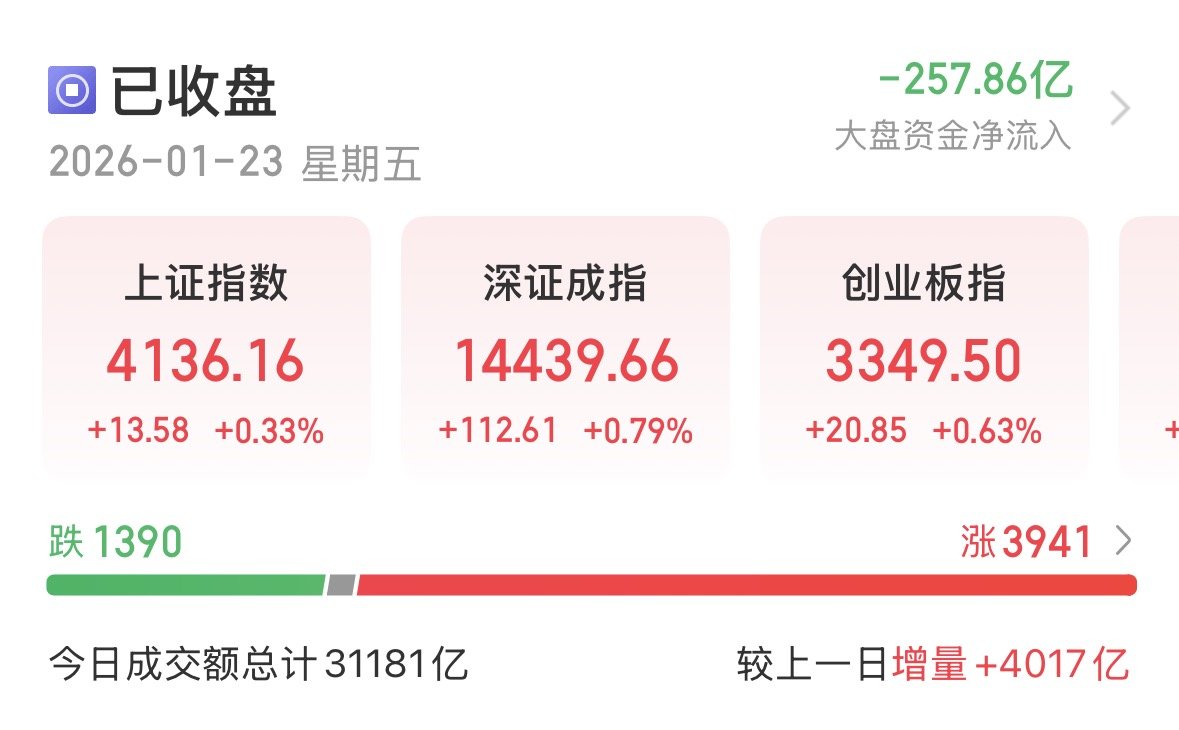 1月23日,A股三大指数在震荡中收涨,尤其是沪指,盘中五升五降最终稳在一个中间数值。截至收盘,沪指涨0.33%,收报4136.16点;深证成指涨0.79%,收报14439.66点;创业板指涨0.63%,收报3349.50点。全市场成交额达到31181亿元,较昨日放量4017亿元。个股方面,近4000只股票上涨,涨停股121只,赚钱效应拉满。