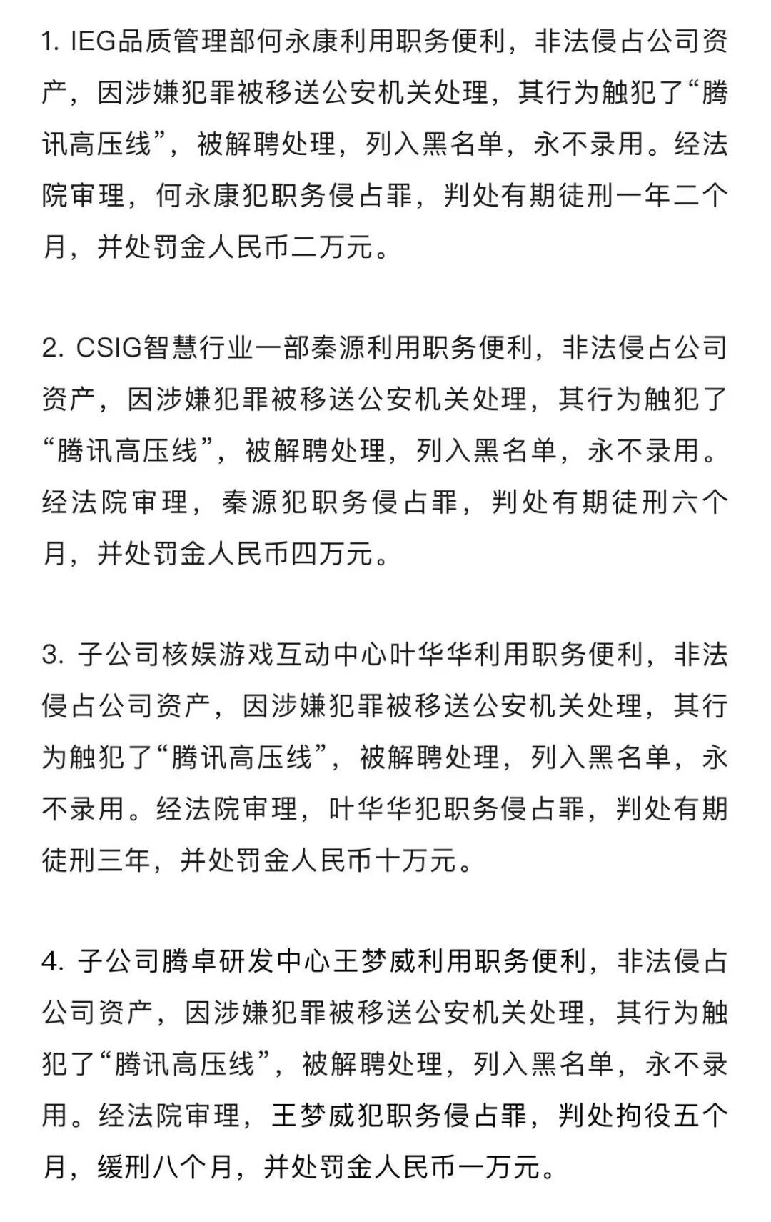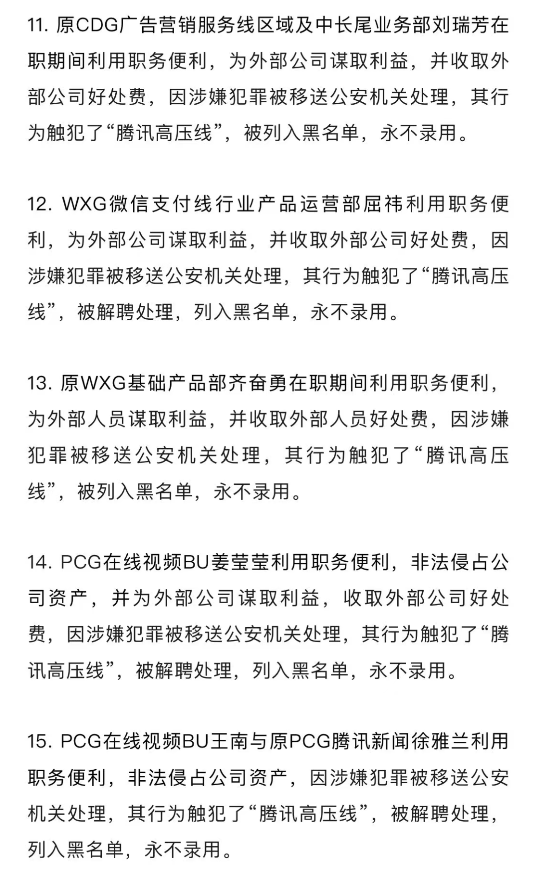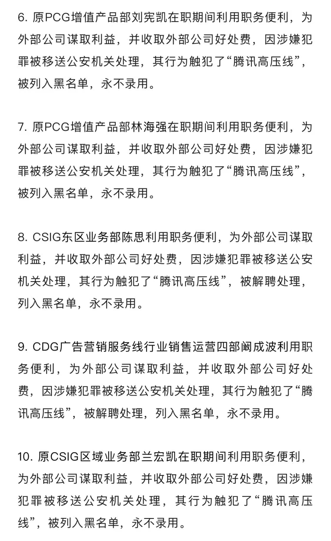 腾讯在通报中重申了对舞弊行为的“零容忍”态度,强调通过制定“腾讯高压线”制度、建立完善的风险管理体系来预防和打击商业贿赂、职务侵占等行为。触犯“高压线”的员工均被解聘并永不录用,涉案外部公司则被列入黑名单,永不合作。涉嫌违法犯罪的人员,腾讯均积极配合司法机关追究其法律责任。