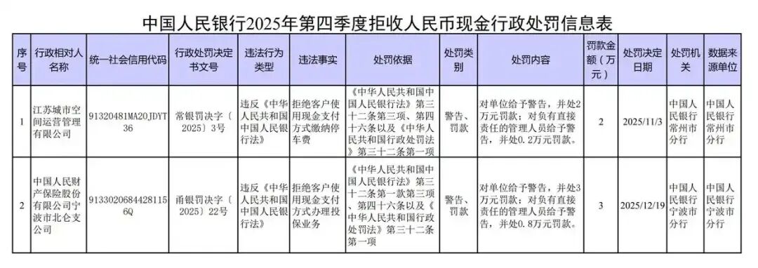 中国人民银行2025年第四季度拒收人民币现金行政处罚信息表