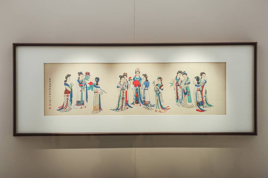 现场,戴媛媛特别提到了两件作品,一件是凝聚赵蕴玉十年心血,堪称工笔典范的《蜀宫乐伎图》。这是1948年赵蕴玉随张大千探访永陵后,通过十年的实地写生、器乐研究、推敲修改后完成的工笔重彩名作。画中22位乐伎姿态生动、细节考究,成为现代工笔人物画典范。“此画共有3个版本,此次在成博展出的是赵蕴玉自己最满意的一幅。”