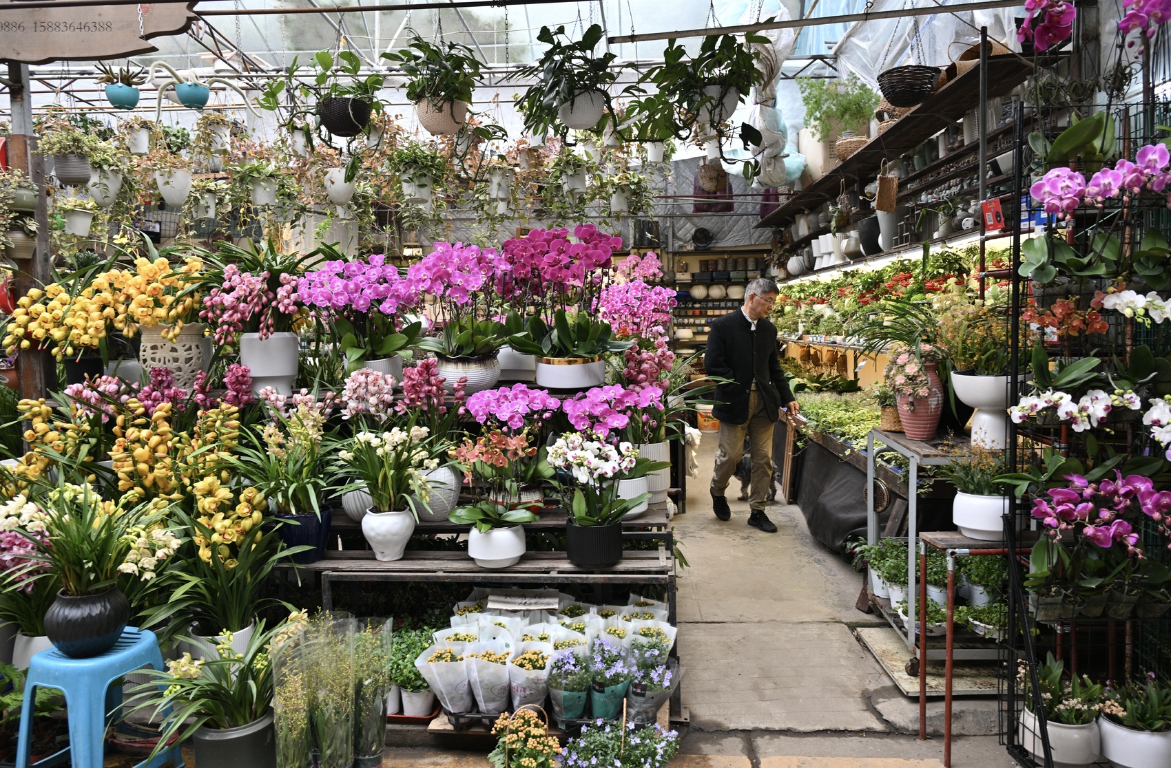 在蝴蝶兰专区,空气中弥漫着淡淡幽香,几位店员忙着对花株进行修剪和组盆。
