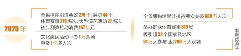 旅游不仅是“看风景”,更与文化、体育、商业、会展、演艺等深度融合,创造了丰富的消费、体验场景。2025年,全省各地招揽引进会议270个、展览44个、体育赛事279场次、大型演艺活动27场次,初步测算拉动消费167亿元;文化惠民活动举办1万余场,惠及1亿多人次;全省博物馆累计接待观众突破600万人次;举办群众体育赛事319场,吸引超32个国家及地区31万人参与、超200万人观赛……旅文广体领域高质量发展亮点突出、成果丰硕。