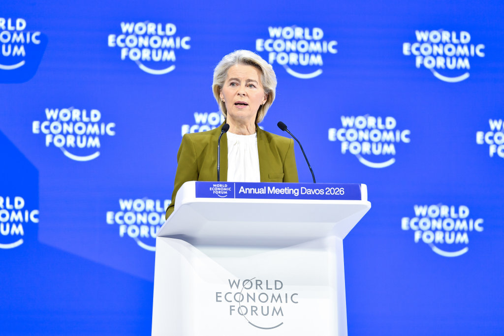 1月20日,欧盟委员会主席冯德莱恩在瑞士达沃斯举办的世界经济论坛上讲话。图据新华社