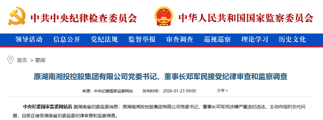 中央纪委国家监委网站讯 据湖南省纪委监委消息:原湖南湘投控股集团有限公司党委书记、董事长邓军民涉嫌严重违纪违法,主动向组织交代问题,目前正接受湖南省纪委监委纪律审查和监察调查。
