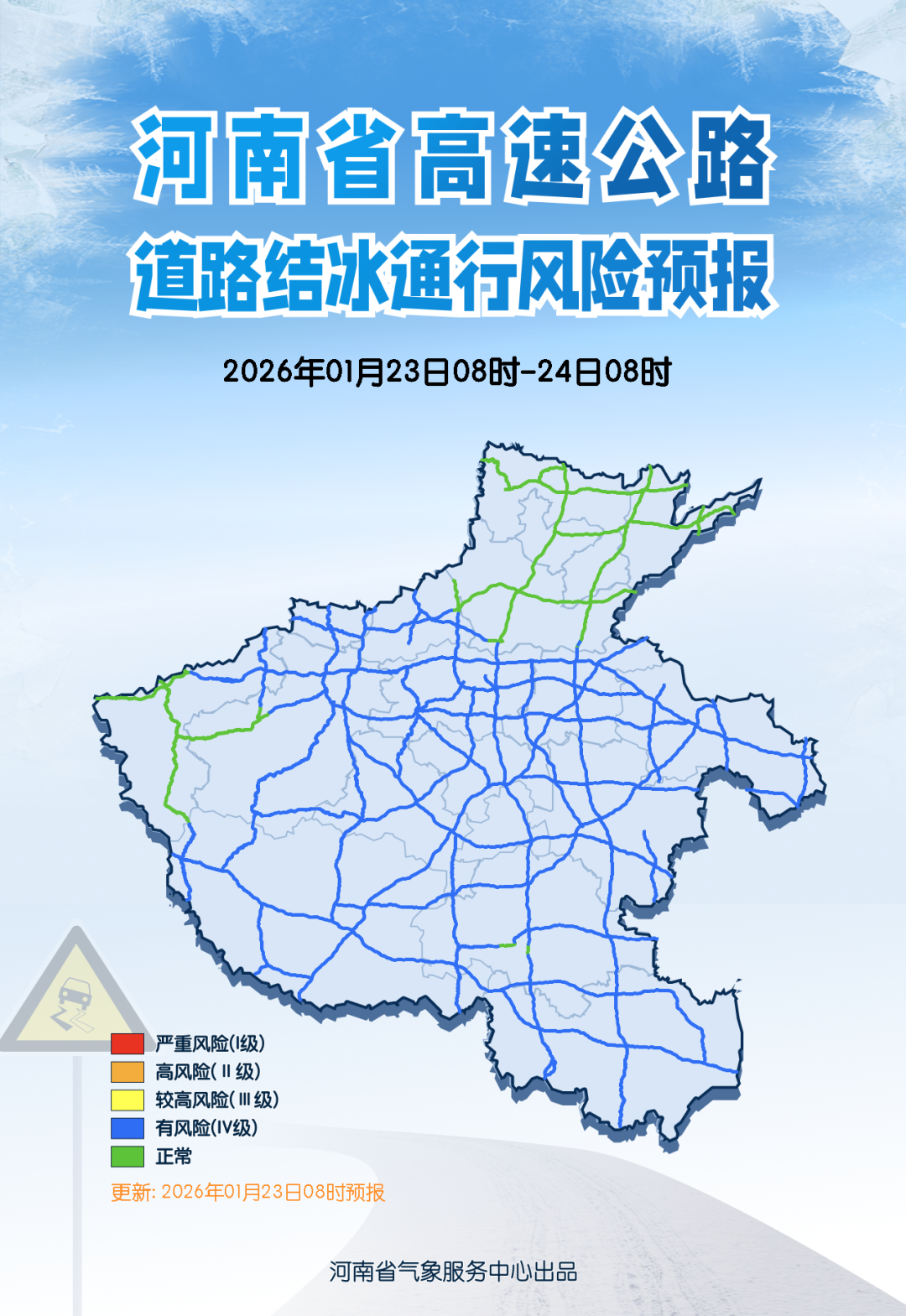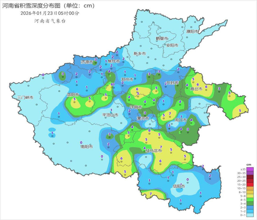 由于温度比较低,今天早上05时,我省沿黄及以南大部有1到5厘米积雪,其中驻马店、商丘西部、周口西部、郑州南部部分县(市、区)6到7厘米。目前,河南省气象台发布的道路结冰黄色预警正在生效中,我省大部高速公路存在道路结冰通行风险,大家外出请务必小心慢行。