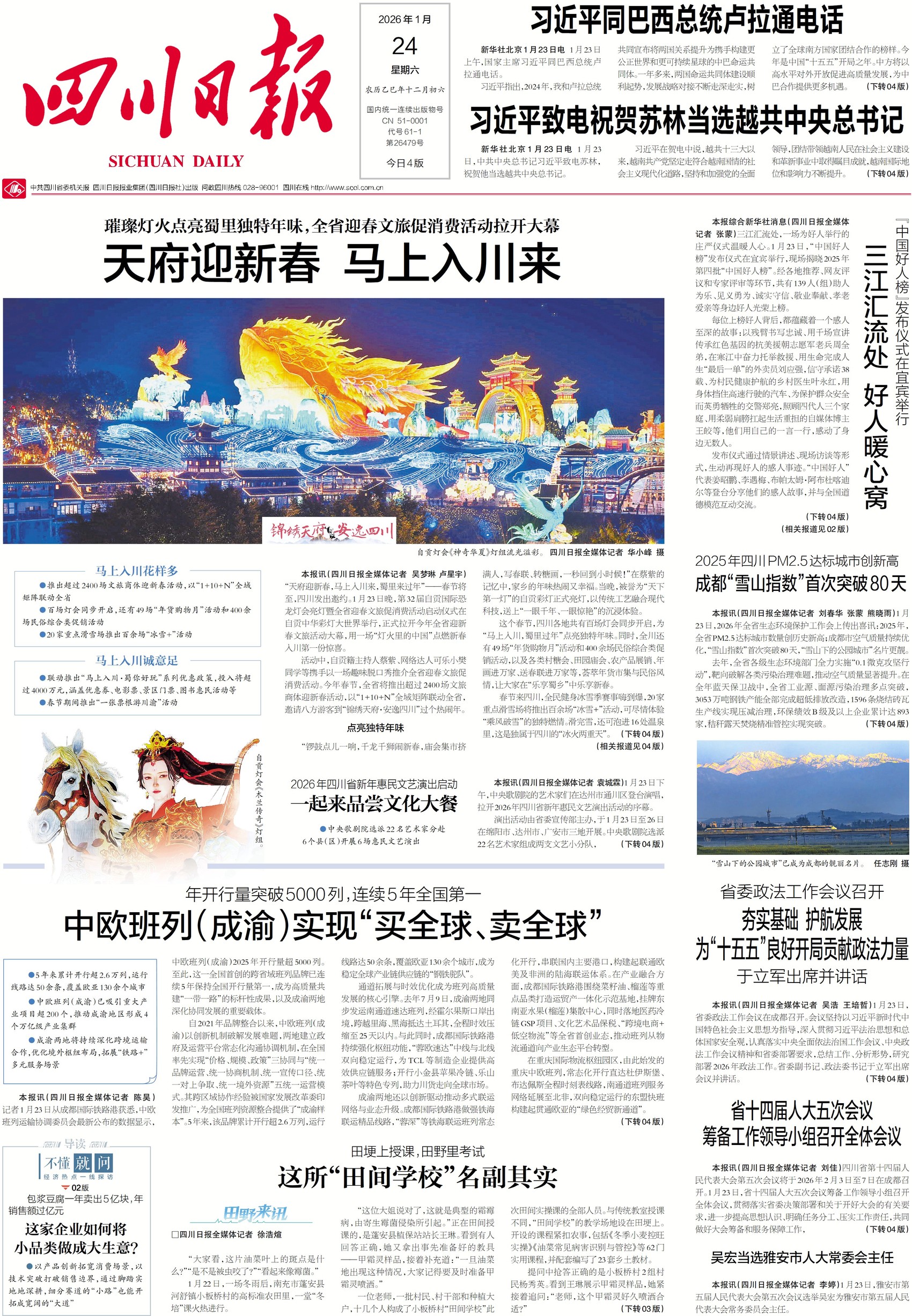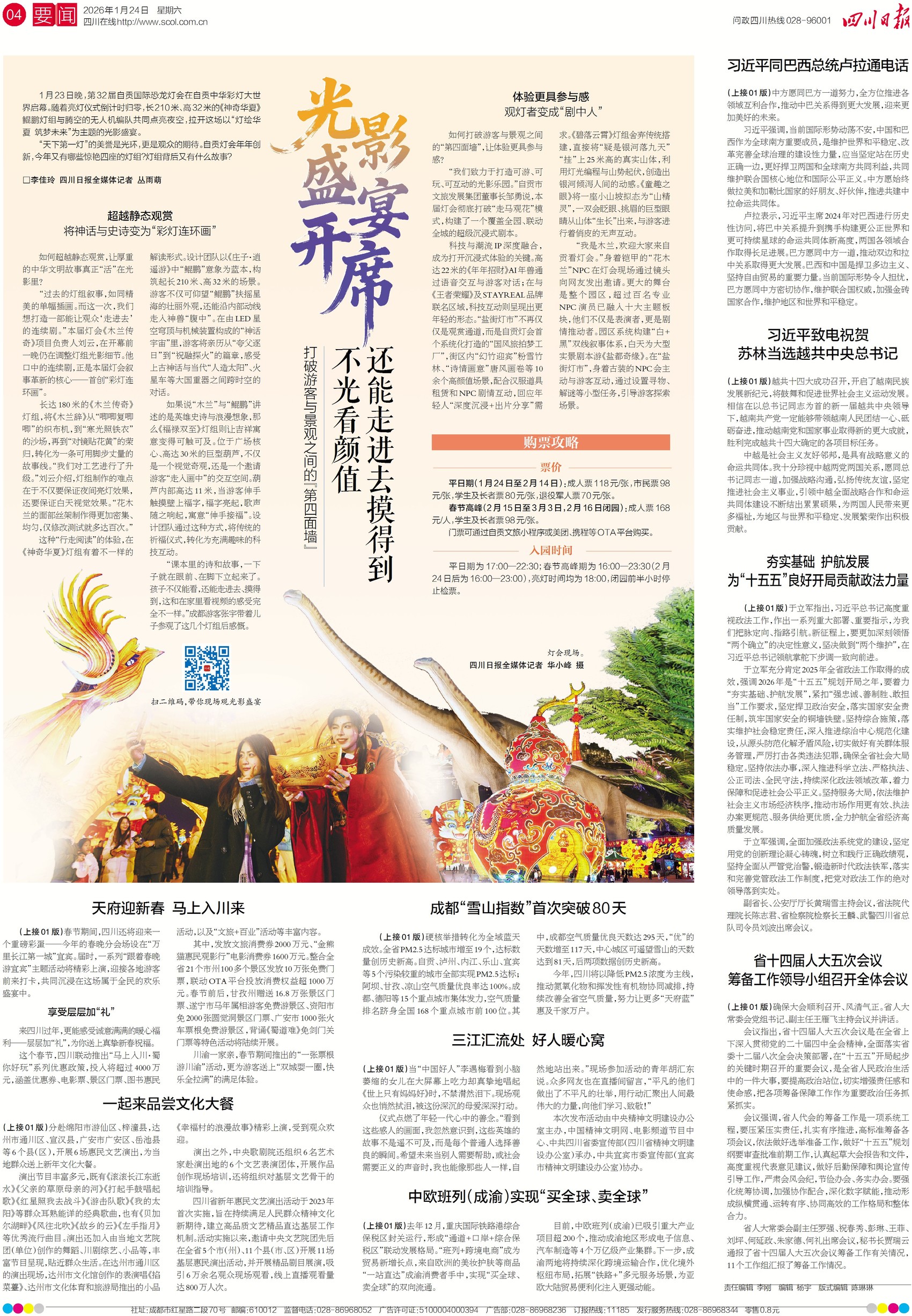 春节将至,四川喊你“马上入川,蜀里过年”——1月23日晚,第32届自贡国际恐龙灯会亮灯暨全省迎春文旅促消费活动启动仪式在自贡中华彩灯大世界举行,正式拉开今年四川迎新春文旅活动的大幕,用一场“灯火里的中国”点燃新春入川第一份惊喜。今年春节,四川将推出超过2400场文旅商体活动,邀请八方游客到“锦绣天府·安逸四川”过个热闹年。快看今天的一版、四版,有新春礼包,有好看的灯会。