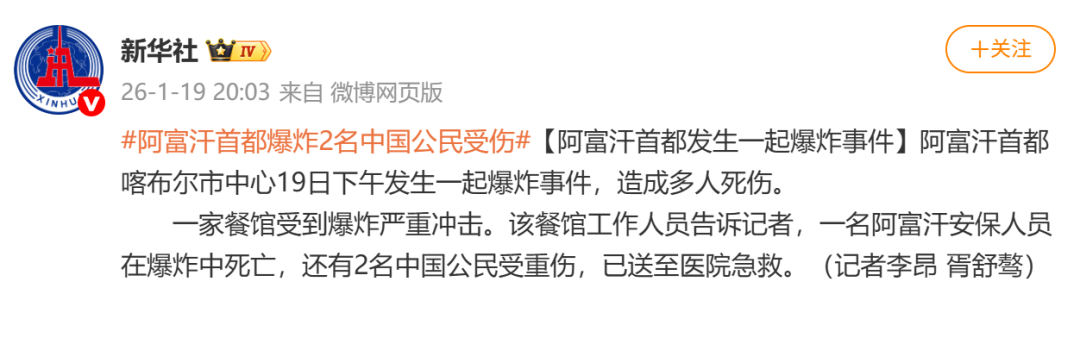 据悉,一家餐馆受到爆炸严重冲击。该餐馆工作人员告诉记者,一名阿富汗安保人员在爆炸中死亡,还有2名中国公民受重伤,已送至医院急救。