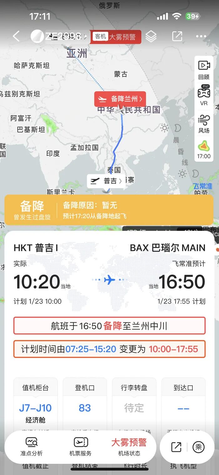 根据飞常准显示,该航班备降兰州中川机场。17时,新黄河记者致电兰州中川机场,工作人员表示,该航班还在盘旋中,还未降落,具体原因还不清楚。