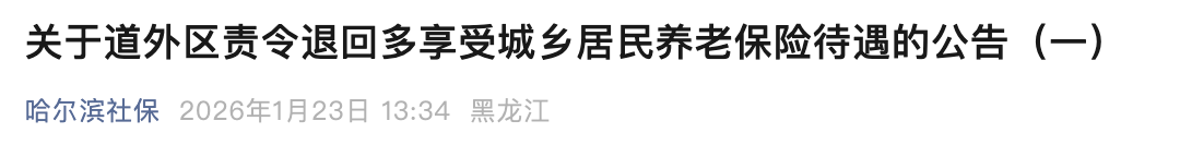 1月23日,黑龙江哈尔滨社保发布“关于道外区责令退回多享受城乡居民养老保险待遇的公告(一)”。