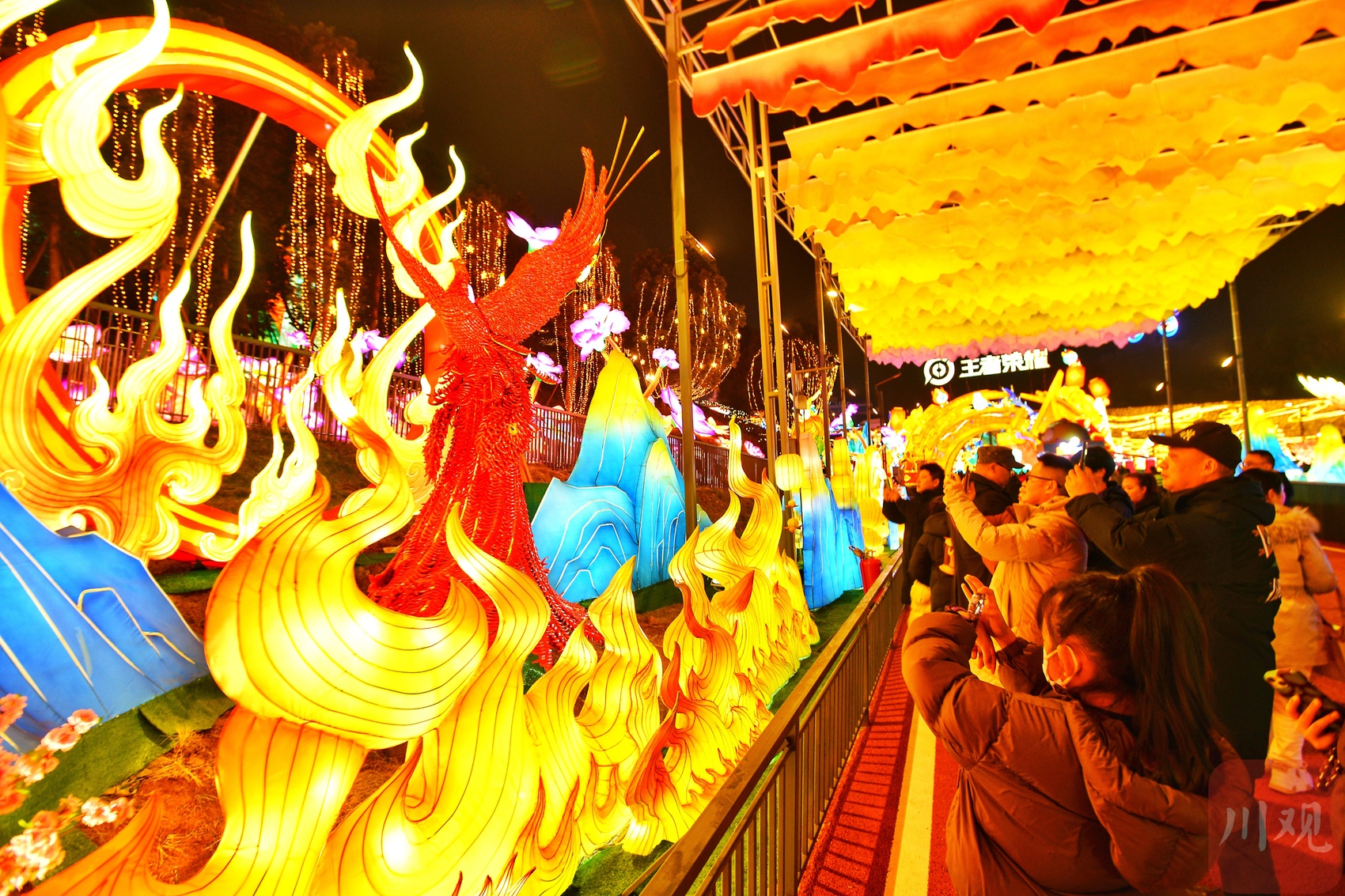 众多市民、游客在灯会里拍照打卡。
