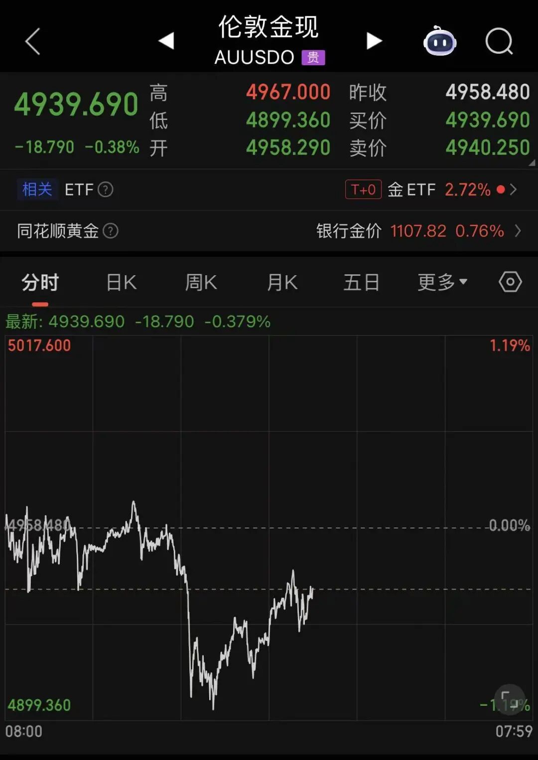 截至23日22时,现货黄金交投于4939美元/盎司附近,早盘最高曾触及4967美元/盎司的历史新高。