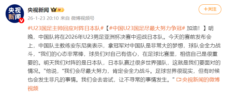 2026亚足联U23亚洲杯于2026年1月7日至25日在沙特阿拉伯进行。北京时间1月24日23:00,中国U-23国家男子足球队将与日本U-23国家男子足球队争夺本届赛事的冠军。