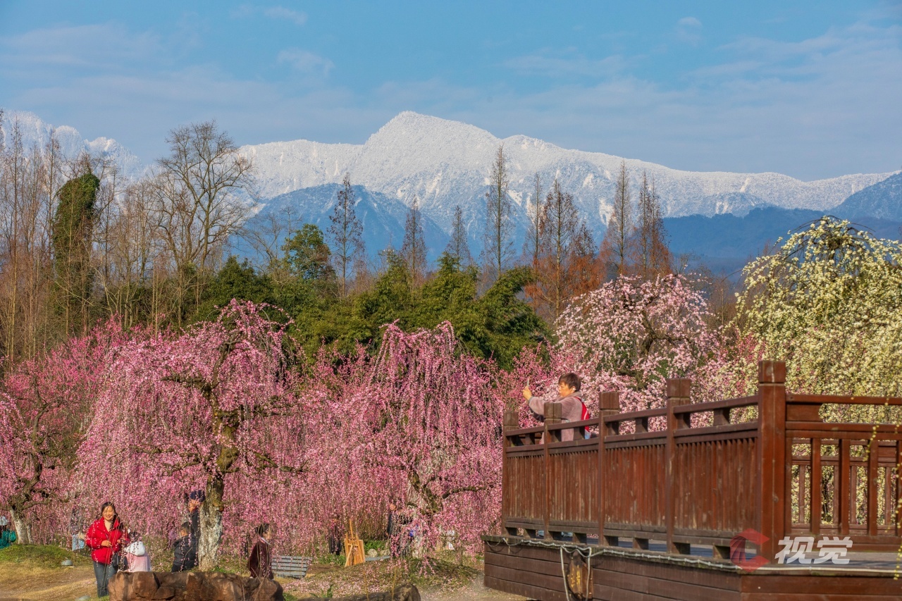 2月25日,在都江堰问花村偶遇雪山与梅林相伴,游客徜徉其中,定格雪山下的浪漫。C视觉签约摄影师 刘建强