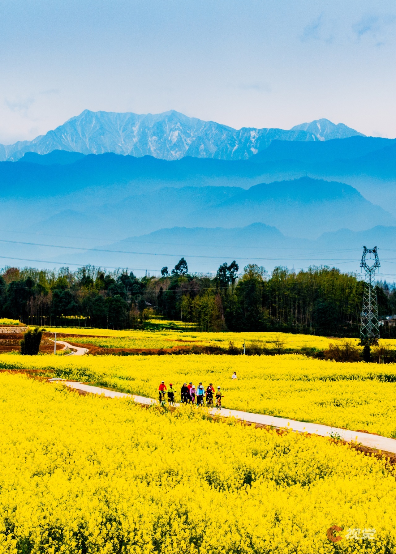 3月18日,崇州市怀远镇,骑行爱好者穿行雪山下的花海。C视觉签约摄影师 李旭